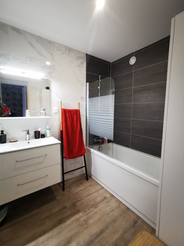 Appartement T3 de 69m2, entièrement rénové et isolé, comprenant un hall d’entrée avec penderie, une belle pièce à vivre lumineuse avec cuisine aménagée et équipée récente, donnant sur un balcon, 2 chambres avec placard, une salle de bain récente, une buanderie avec WC. Atouts : rénové et entièrement et isolé. Exposé sud/ouest. Menuiseries double vitrage avec volets roulants…