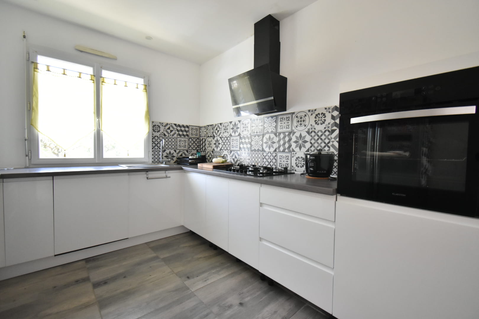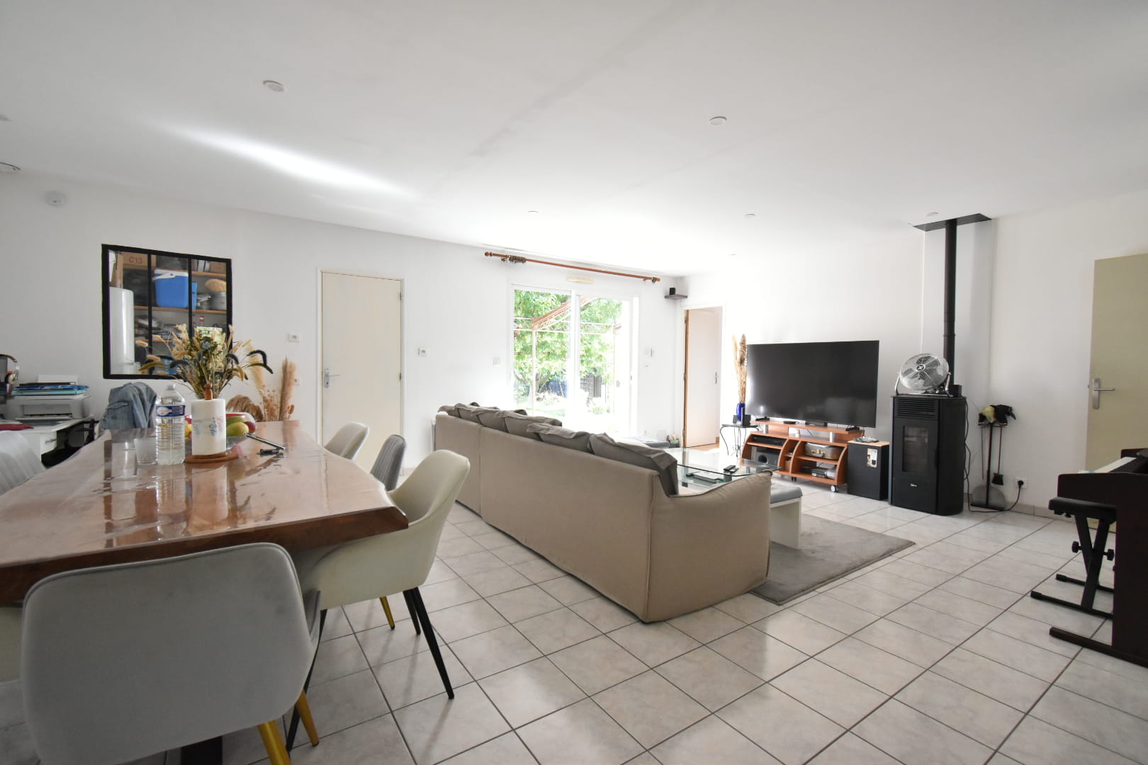 Une entrée, une cuisine équipée ouverte sur un salon séjour, une buanderie, 3 chambres, une salle de bain et un w.c.