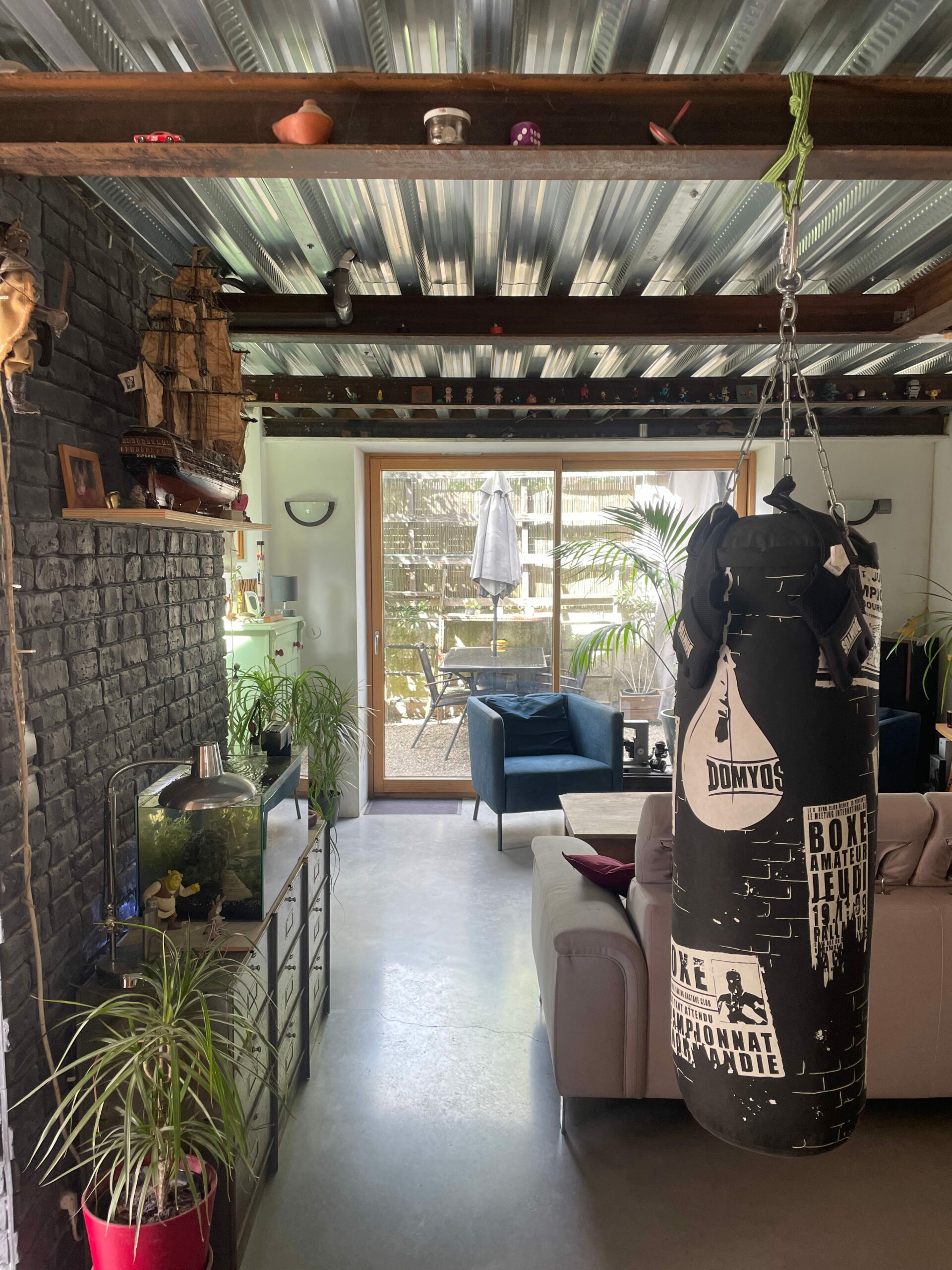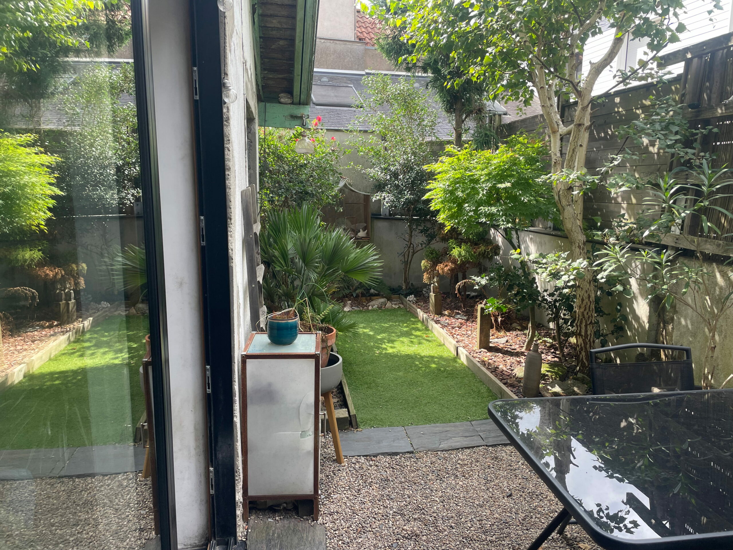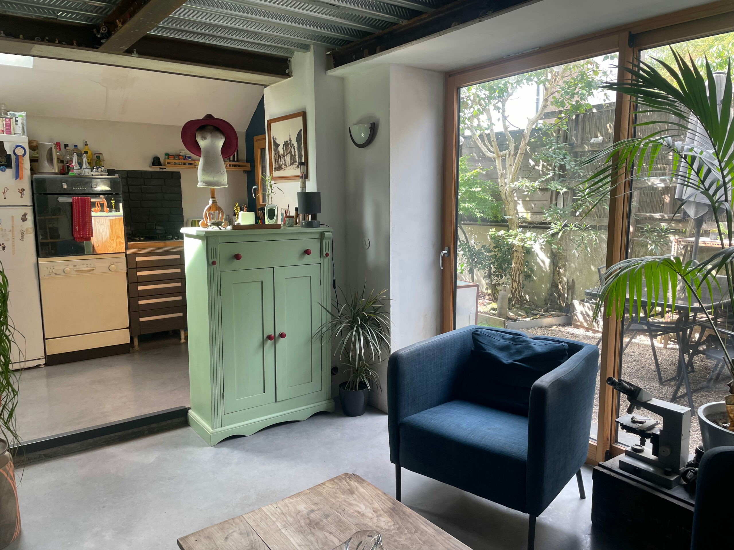 De larges baies vitrées ouvrent sur un jardinet et une annexe.