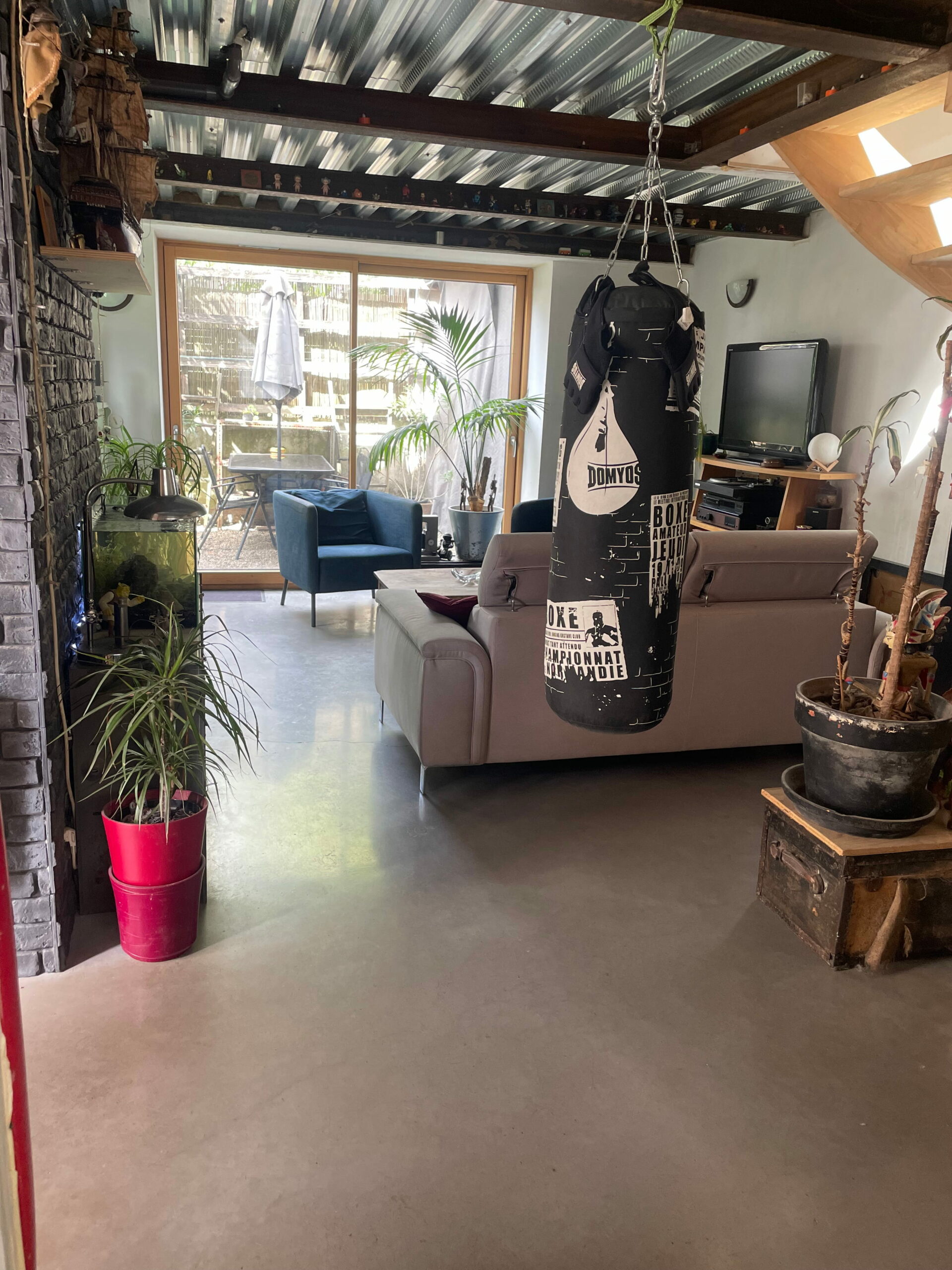 Cette maison atypique à l’abri des regards propose une belle pièce de vie avec cuisine ouverte sur un sol en béton ciré.